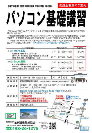 令和7年度岩手県委託訓練事業離職者等再就職訓練(知識等習得コース3ヶ月)