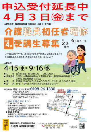 花巻高等職業訓練校では、令和8年度入校生を募集しております。ご希望の事業主様は、お早めに手続きをされるようお願いいたします。